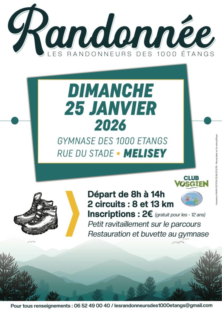 Catégories Randonnée 25 Janv 2026 : Melisey -Marche Populaire Auteur de l’article Par admin-lesbd Date de l’article 9 janvier 2026 Aucun commentaire sur 25 Janv 2026 : Melisey -Marche Populaire Rendez Vous à 9 h à Roye ( parking Pro-Ramonage) pour covoiturage jusqu’au gymnase de Melisey ← 04 Jan 2026 : Luxeuil- La forêt du Banney Laisser un commentaire Annuler la réponseVous devez vous connecter pour publier un commentaire.